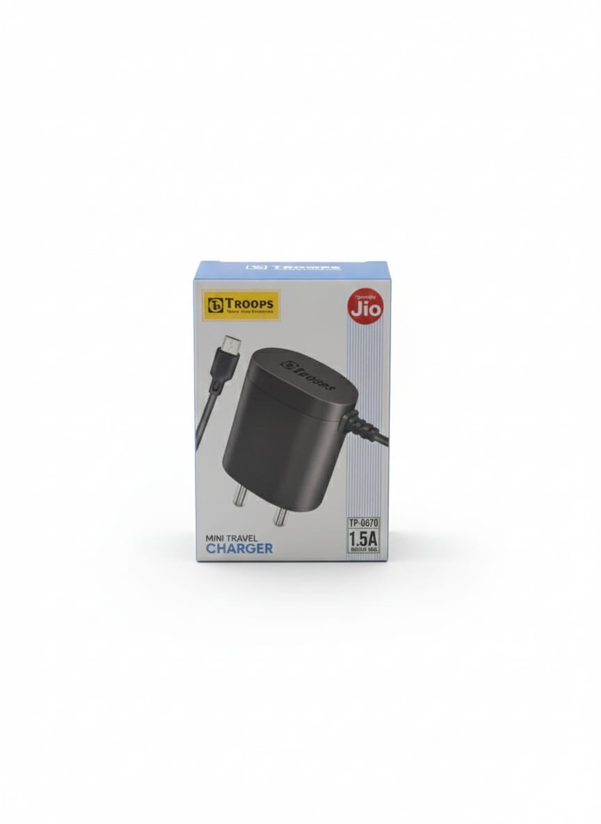 Charge your devices safely and efficiently with the Troops Mini Travel Charger. Designed for daily use and travel convenience, this compact charger delivers a stable 1.5A output for fast and reliable charging. Its lightweight build makes it easy to carry, while the sturdy construction ensures long-lasting performance. Compatible with Jio phones and other USB-powered devices, it’s an ideal charging solution for home, office, or travel.